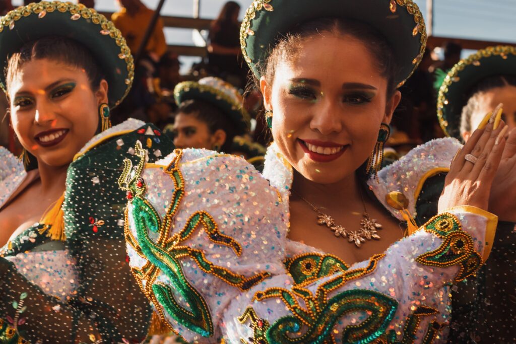 Le origini del Carnevale di Oruro risalgono alle antiche culture preispaniche della regione andina, in particolare alla civiltà Uru che abitava quest’area. Dopo la colonizzazione spagnola, gli elementi indigeni si fusero con quelli cattolici, dando vita a questa celebrazione sincretica. Le danze e le rappresentazioni narrano miti e leggende legati alla cosmogonia andina, come la Danza del Diavolo, con i suoi costumi piumati e le maschere demoniache. L’opulenza e gli eccessi sono collegati alla fine della stagione del raccolto e all’arrivo di un periodo di relativo riposo prima della nuova semina. Alcune credenze spirituali andine vedono il carnevale come un momento per ringraziare la Pachamama (Madre Terra) per i suoi frutti e come un’occasione propizia per riti di fertilità in vista del nuovo ciclo agricolo.