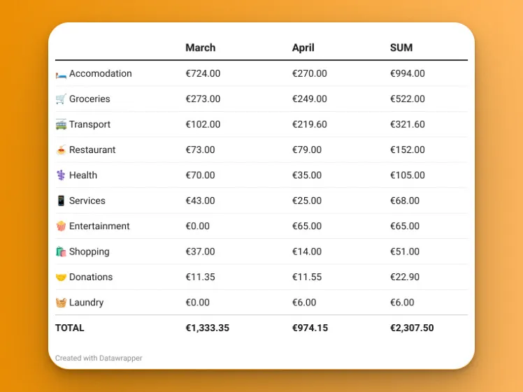 Durante il mio soggiorno a Corralejo ho speso in totale €2.307,50, inclusi i €102 del volo d’andata (acquistato a febbraio). La media mensile è stata di €1.153,75.
